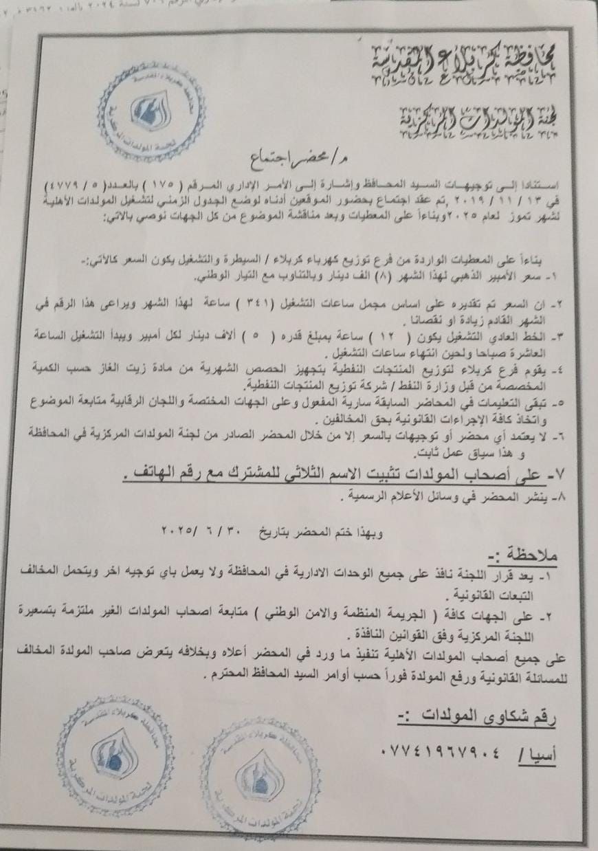 حددت لجنة المولدات المركزية في محافظة كربلاء المقدسة، الثلاثاء، سعر "أمبير" المولدات الأهلية لشهر تموز الجاري.