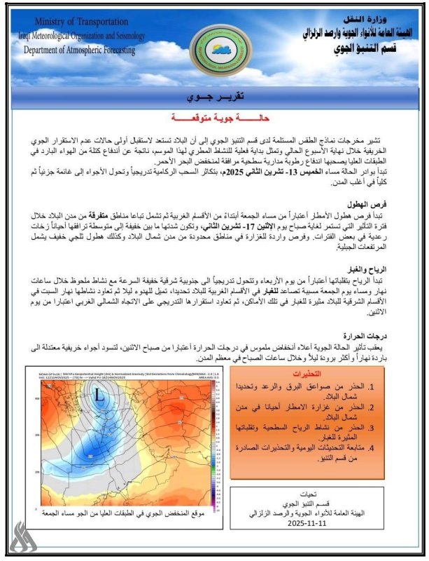 وأضاف أن "بوادر الحالة ستبدأ مساء الخميس (13 تشرين الثاني 2025)، بتكاثر السحب الركامية تدريجياً وتحول الأجواء إلى غائمة جزئياً ثم كلياً في أغلب المدن"، مشيراً إلى أن "فرص هطول الأمطار تبدأ اعتباراً من مساء الجمعة، ابتداءً من الأقسام الغربية، لتشمل لاحقاً مناطق متفرقة من البلاد حتى صباح الاثنين (17 تشرين الثاني)".