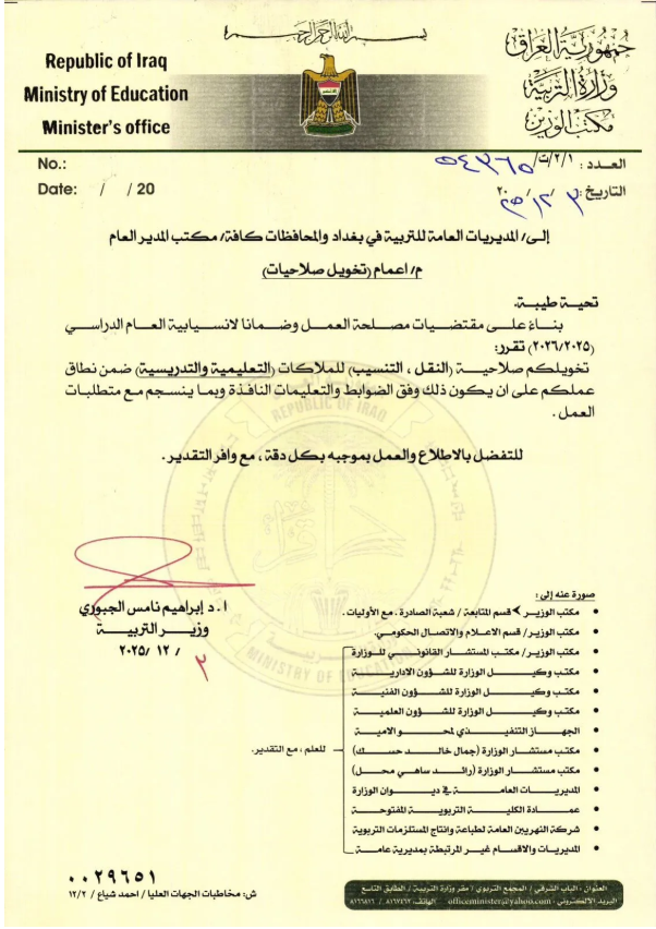 التربية تمنح صلاحيات النقل والتنسيب للملاكات التعليمية والتدريسية إلى المديرين العامين