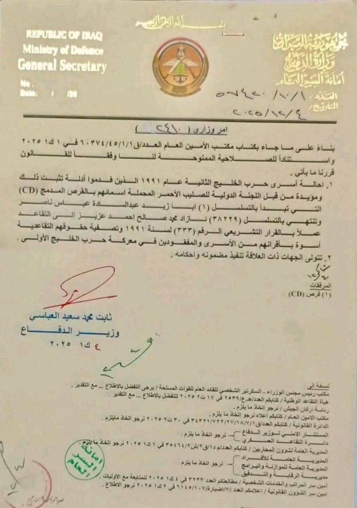 أصدرت وزارة الدفاع، امس الخميس، أمراً وزارياً باحالة أسرى حرب الخليج الثانية عام 1991 إلى التقاعد.