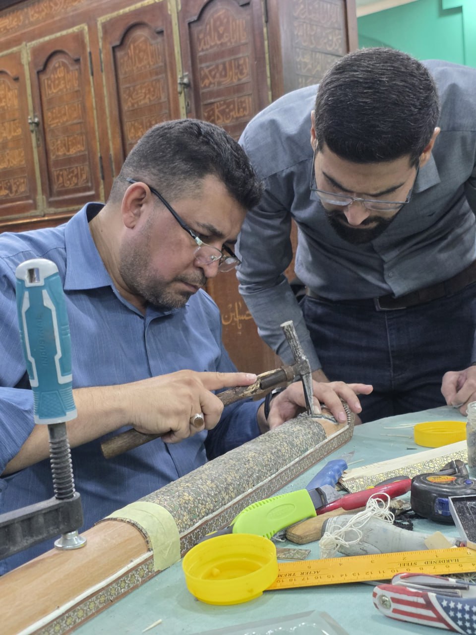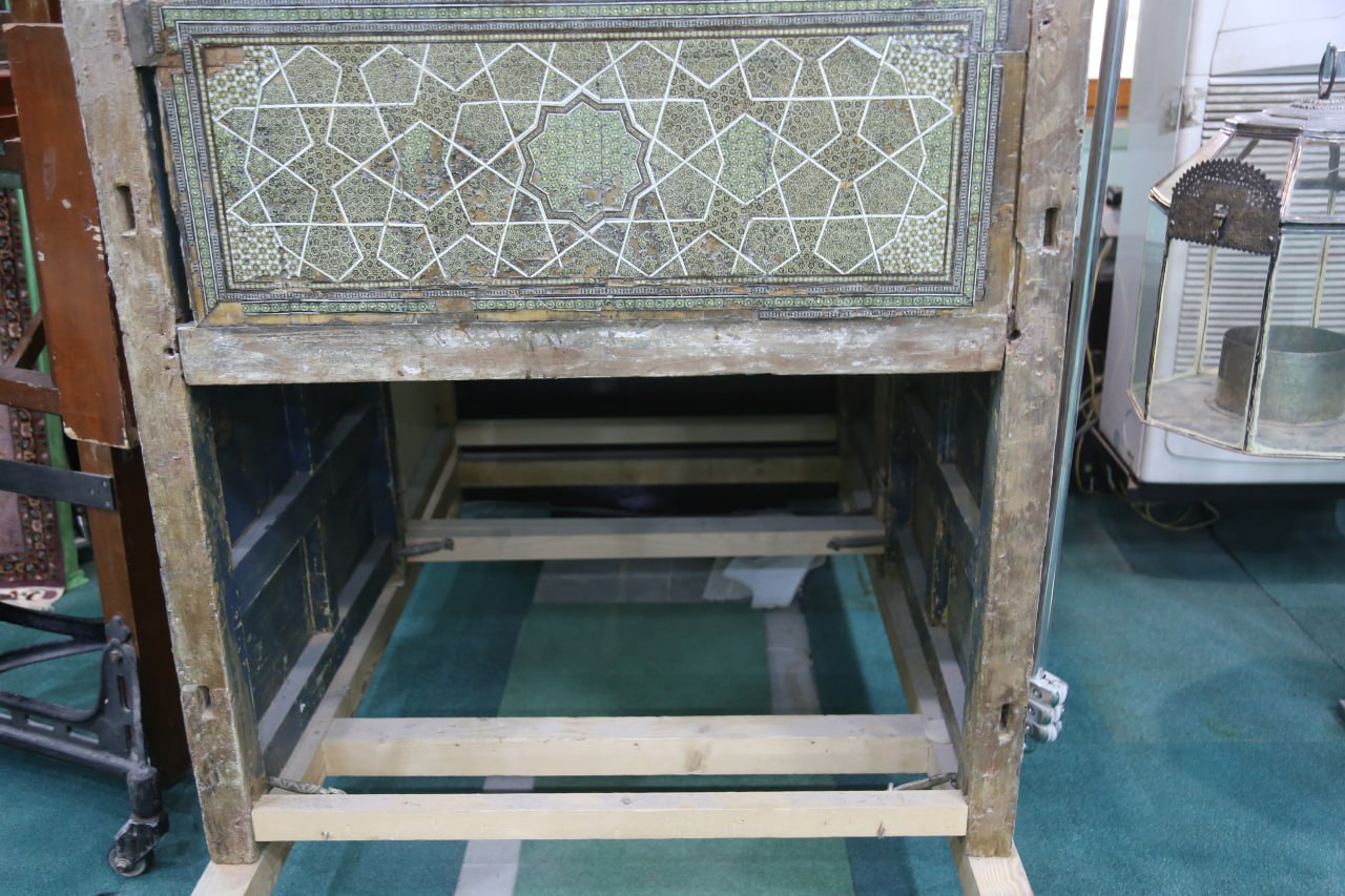 وقال مسؤول شعبة الصيانة والترميم داخل حرم الامام الحسين (عليه السلام) "حسنين رحمن عبد الله" في تصريح لوكالة نون الخبرية ان "العمل بدأ بجمع المقتنيات التي تخص متحف الامام الحسين (عليه السلام) في بداية تأسيسه في العام (2009)، وعثرنا على قطع خشبية في مواقع عدة لم نعرف حينها الى اي شيء تعود وكانت توقعاتنا انها تعود الى الصندوق الخشبي للقبر الشريف كونها تمتاز بفن يسمى "فن الخاتم" وقد سمي بهذا الاسم كونه خاتم لجميع الفنون، الذي يدخل بصناعته حوالي (7) انواع من الاخشاب بالوان طبيعية، كما يدخل بصناعته معادن الفضة والذهب من القطع الثمينة"، مستدركا بالقول "لكن الآن ومع الحداثة التي طرأت استبدلت هذه القطع بالألمنيوم وغيرها من المعادن، وبعد ان جمعنا جميع القطع الخشبية في العام (2011)، وجدنا انها عبارة عن منبر خطابة يعود تاريخه الى حوالي (185) عاما ميلاديا، واهدي الى مرقد الامام الحسين (عليه السلام) من قبل رئيس وزراء الدولة القاجارية "الميرزا ابو الحسن خان" حيث كتب اسمه اعلى المنبر، وقد بحثنا عن هذا الاسم ووجدنا انه بالفعل رئيس الوزراء حينها، ومن المؤسف اننا عندما بدأنا بترميم هذه القطع وجدناها تضررت بشكل كبير نتيجة الرطوبة وغيرها، بسبب الخزن غير الصحيح لعدم معرفة من خزنها بقيمتها"، مشيرا بالقول" لكننا بعد ان انتظمنا في دورات تدريبية عالية المستوى في المتحف العراقي، تمكنا من تقليل الضرر الحاصل الى ادنى حد باستخدام المادة اللاصقة "الغراء".