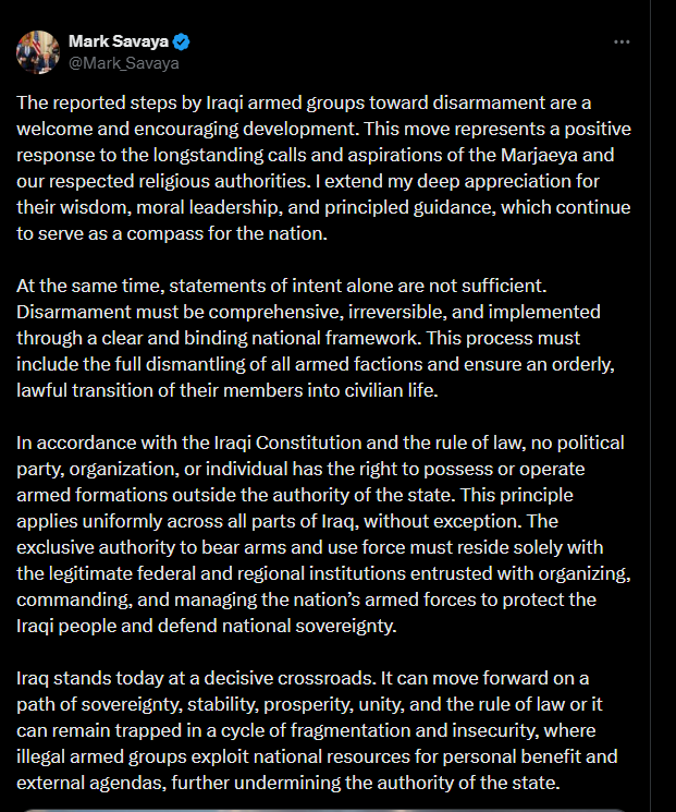 وأشار سافايا إلى أن "العراق يقف عند مفترق طرق حاسم، إما التقدم نحو السيادة والاستقرار والوحدة والازدهار أو الاستمرار في حالة من التشرذم وانعدام الأمن، إذ تستغل الجماعات المسلحة غير الشرعية الموارد الوطنية لخدمة مصالحها الخاصة وأجنداتها الخارجية، بما يضعف سلطة الدولة ويقوّض استقرارها"، وفق قوله.