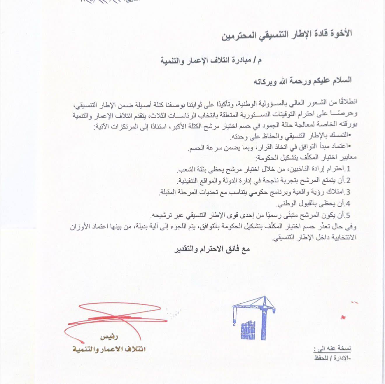 وختم الائتلاف بالقول: "في حال تعذر حسم اختيار المكلف بتشكيل الحكومة بالتوافق، يتم اللجوء إلى آلية بديلة، من بينها اعتماد الأوزان الانتخابية داخل الإطار التنسيقي".