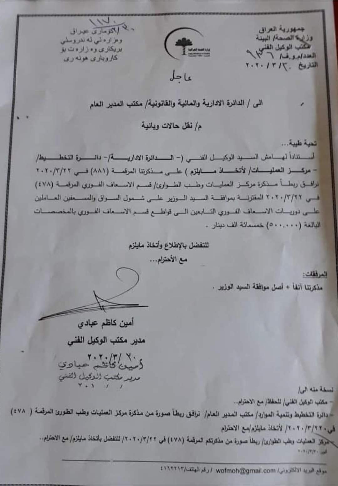 وافق وزير الصحة والبيئة العراقي صادق جعفر علاوي، يوم الاثنين، على شمول فئات جديدة بمنحة الـ500 ألف للعاملين مع المصابين بفيروس كورونا.