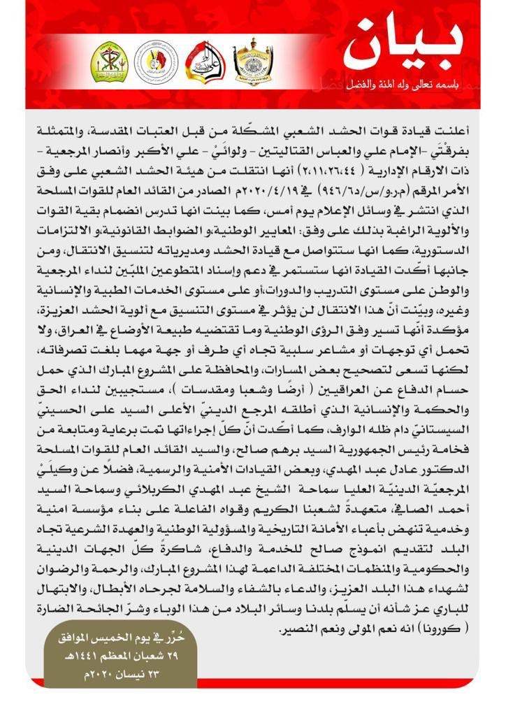 أصدرت قيادة قوات فرقتي “العباس” و “الإمام علي” القتاليتين، ولواءي “علي الأكبر” و “أنصار المرجعية”، توضيحاً بخصوص انفكاكها عن هيئة الحشد الشعبي.