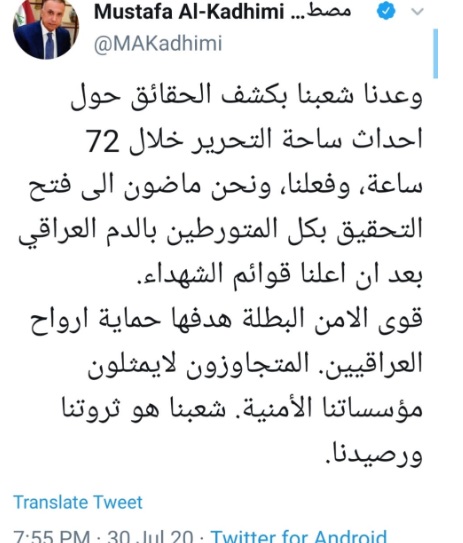 وكتب الكاظمي في تدوينة تابعها وكالة نون (30 تموز 2020): "وعدنا شعبنا بكشف الحقائق حول احداث ساحة التحرير خلال 72 ساعة، وفعلنا، ونحن ماضون الى فتح التحقيق بكل المتورطين بالدم العراقي بعد ان اعلنا قوائم الشهداء".