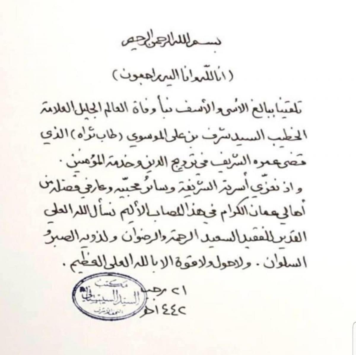 تلقّينا ببالغ الأسى والأسف نبأ وفاة العالم الجليل العلّامة الخطيب السيّد شرف بن علي الموسويّ (طيّب الله ثراه)، الذي قضى عمره الشريف في ترويج الدين وخدمة المؤمنين، وإذ نعزّي أسرته الشريفة وسائرَ محبّيه وعارفي فضله من أهالي عمان الكرام في هذا المصاب الأليم.