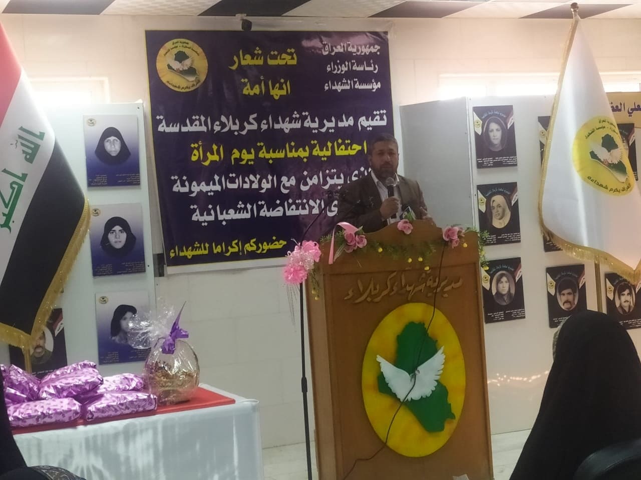 وقالت مسؤولة شعبة الرعاية الاجتماعية والصحية "مثال گاطع القطيفي" اننا نحتفل اليوم بمناسبة يوم المرأة والذي يتزامن مع الولادات الميمونة وذكرى الإنتفاضة الشعبانية ونستذكر ماخلفه النظام السابق من المآسي والتركات الثقيلة، فقد سقطت آلاف الشهيدات بسبب فكر ورأي ، موضحة ان المراة العراقية في العهد الماضي لم تسلم من ملاحقات النظام وأزلامه، بل كانت مضطهدة مثل أخيها الرجل، وربما وقع عليها ثقلا وظلماً أكبر حيث تعرضت إلى السجن والإبادة إضافة إلى الحزن بفقدان الولد والأم والتيتم والتهجير والإبعاد والفصل السياسي.