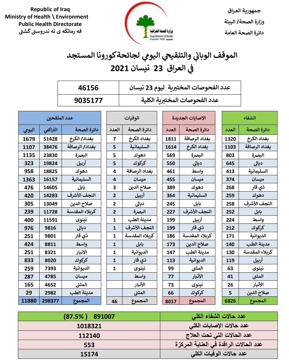 وأجري في العراق حتى اليوم 9.035.177 فحص مختبري لتشخيص الإصابات بكورونا، منها 46.156 خلال آخر 24 ساعة.