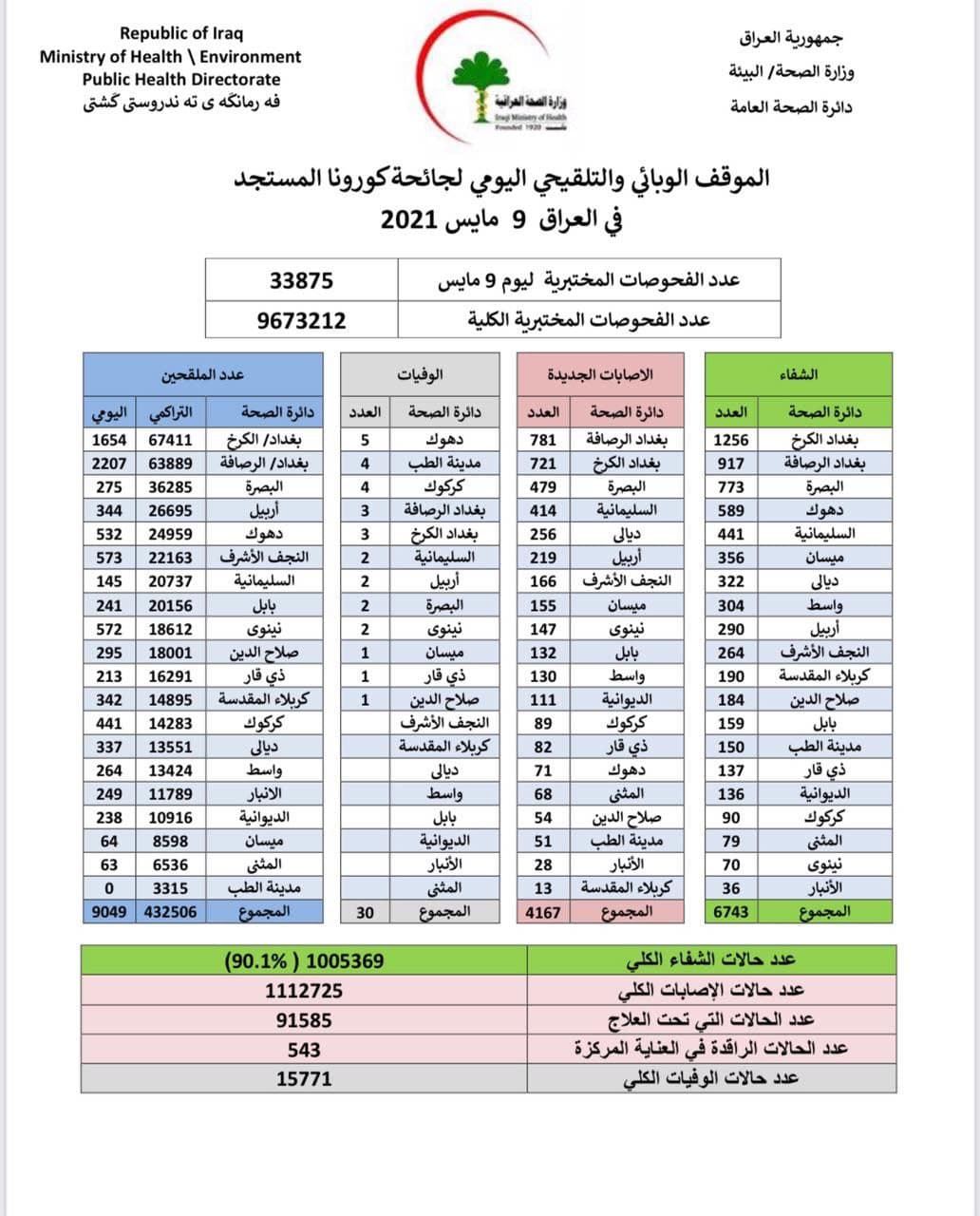 أعلنت وزارة الصحة، اليوم الأحد، الموقف الوبائي الخاص بجائحة كورونا في عموم العراق.