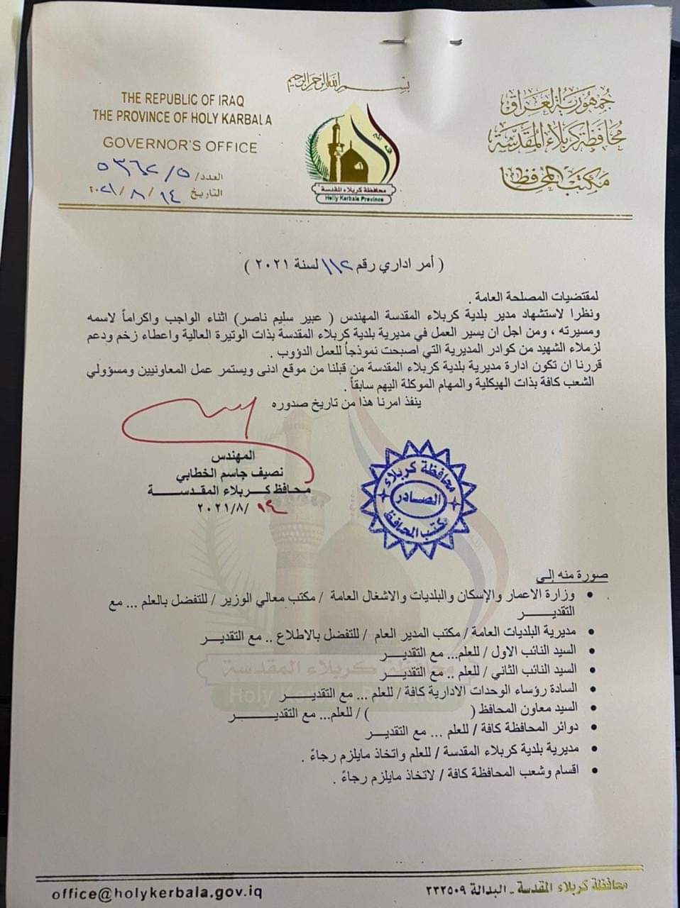 كما قدم المحافظ شكره وتقديره العالي الى المرجعية الدينية الرشيدة وممثلين المرجعية ورئيس مجلس الوزراء والحكومة الاتحادية واهالي كربلاء وكل من وقف مع كربلاء المقدسة وقدمت التعازي.