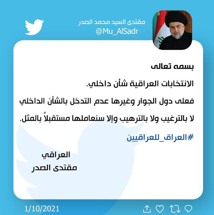 وذكر الصدر في تدوينة، اطلعت عليه وكالة نون اليوم (1 تشرين الأول 2021)، ان "الانتخابات شأن داخلي، فعلى دول الجوار وغيرها عدم التدخل بالِشأن الداخلي لا بالترغيب ولا بالترهيب، والا سنعاملها مستقبلاً بالمثل".
