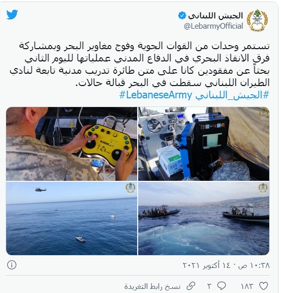 وكان رئيس الجمهورية ميشال عون قد طلب من الأجهزة المعنية تركيز الجهود للبحث عن الطائرة والراكبين اللذين كانا على متنها، فيما طلب رئيس الحكومة نجيب ميقاتي من قيادة الجيش اللبناني إرسال طوافة للمساعدة في عملية البحث.