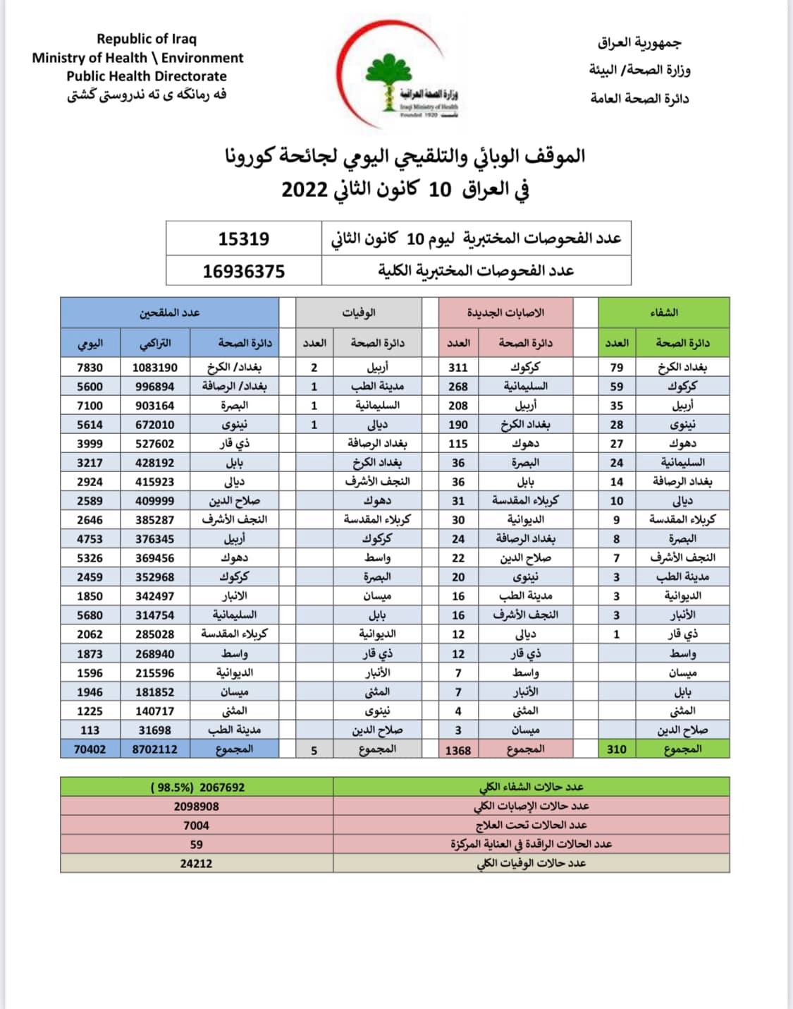 وذكرت وزارة الصحة العراقية في تقريرها اليوم أن إجمالي عدد الإصابات الناجمة عن الفيروس منذ انتشار الوباء في البلاد ارتفع إلى 2098908 والوفيات إلى 24212 بينما ارتفع عدد المتعافين إلى 2067692 شخصاً.