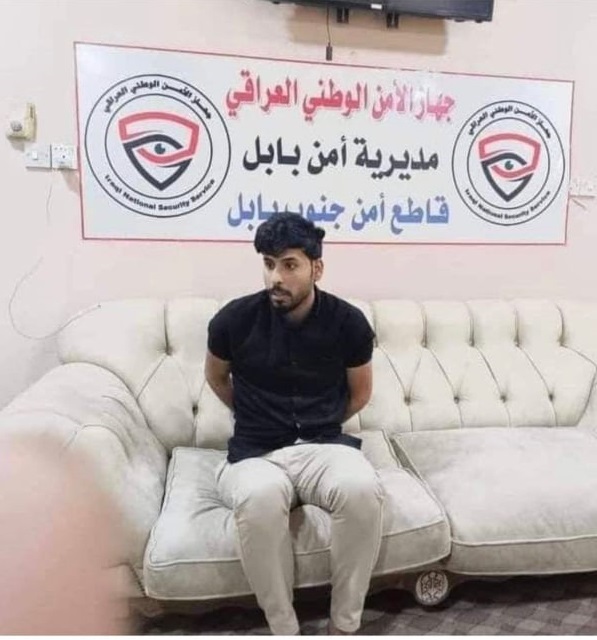 وتظهر الصورة خطيب جامع الفتح في الحمزة الغربي في محافظة بابل مكبل اليدين في قبضة الجهات الأمنية.