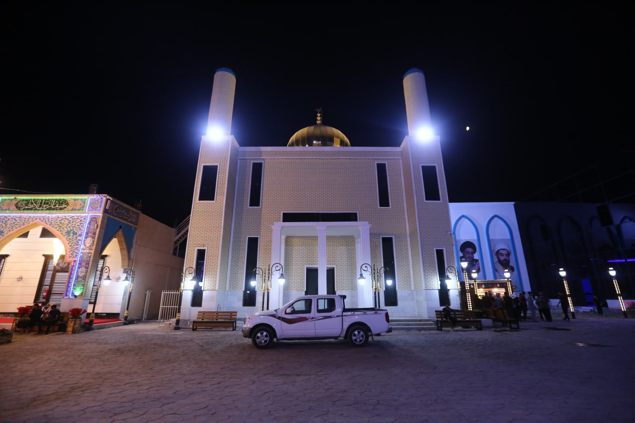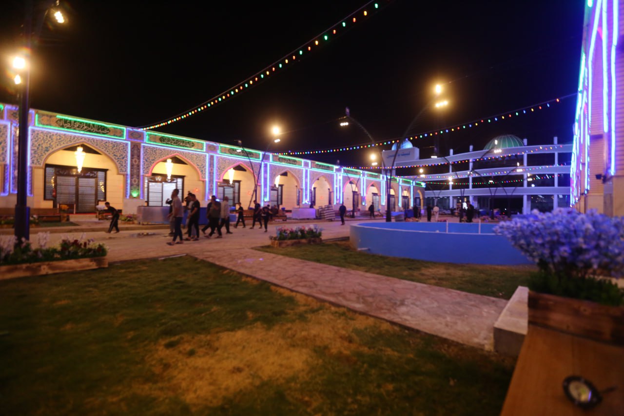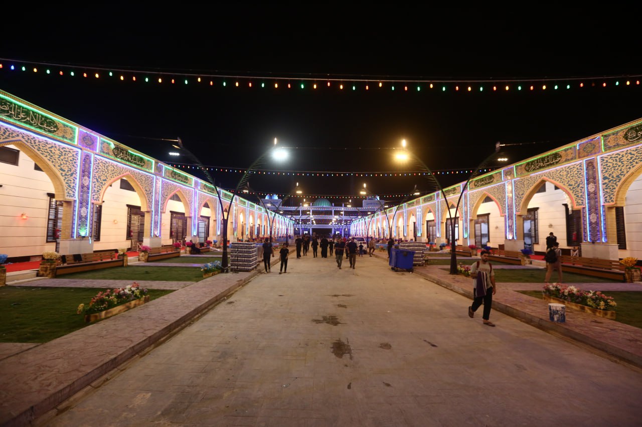 واجهة بأقواس عالية وانارة خلابة ومباني ضخمة وحدائق غناء تضمها مدينة "الراية" للزائرين التي افتتحت هذا العام على الطريق الرابط بين محافظتي كربلاء المقدسة والنجف الاشرف، فيها مسجدين كبيرين ومضائف ومطاعم بخدمات فندقية سعتها لا تدانى، وخدمات اخرى صحية واطعام وترفيهية، تديرها لجان عدة هندسية ولوجستية وخدمية وامنية تعمل كخلية نحل او مؤسسة عريقة فتحت ابوابها لاستقبال حشود الزائرين مبيتا واطعاما وعلاجا وعبادة واستراحة.