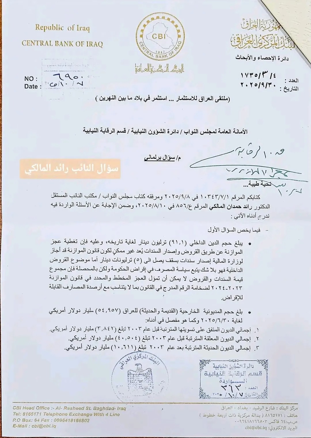 وأعلن البنك المركزي العراقي، يوم السبت الماضي، ارتفاع الدين الداخلي للعراق لشهر تموز 2025.