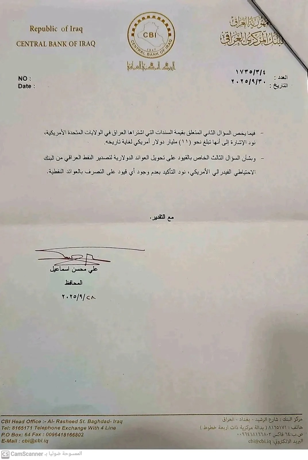 ووفقا للعلاق، فإن "قيمة السندات التي اشتراها العراق في الولايات المتحدة الامريكية بلغت 11 مليار دولار".