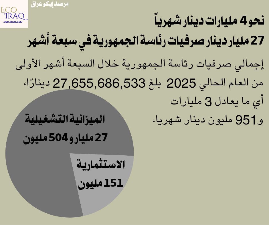كشف مرصد "إيكو عراق"، اليوم الثلاثاء، أن الصرفيات الفعلية لرئاسة الجمهورية بلغت نحو 4 مليارات دينار شهرياً، مشيراً إلى أن 99% منها تذهب للنفقات التشغيلية، بما في ذلك الرواتب والسفر والمستلزمات الإدارية والحماية، دون وجود أي نشاط تشريعي أو مشاريع تنفيذية بارزة.