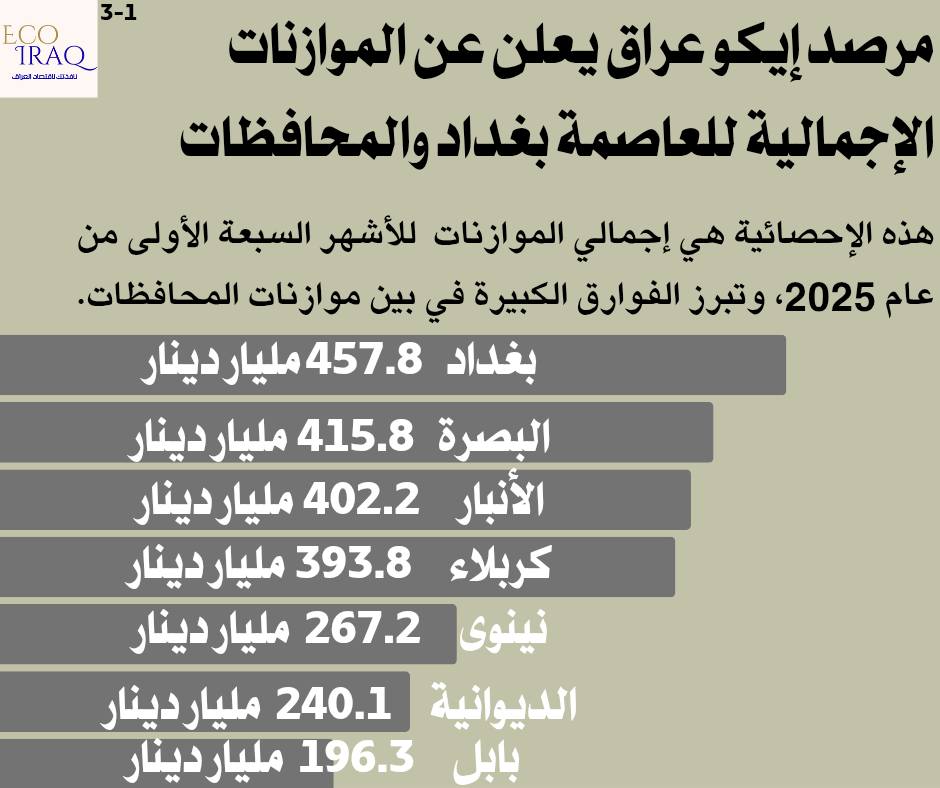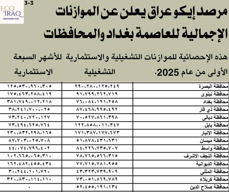 واعتبر "إيكو عراق" أن "الأرقام تعكس تفاوتًا تنمويًا واضحًا بين المحافظات العراقية، إذ تركز بعض الحكومات المحلية على النفقات التشغيلية، فيما تتجه أخرى نحو الاستثمار والبنية التحتية"، مؤكداً على "ضرورة اعتماد سياسات مالية أكثر توازناً لتحقيق تنمية عادلة وشاملة بين جميع مناطق البلاد".