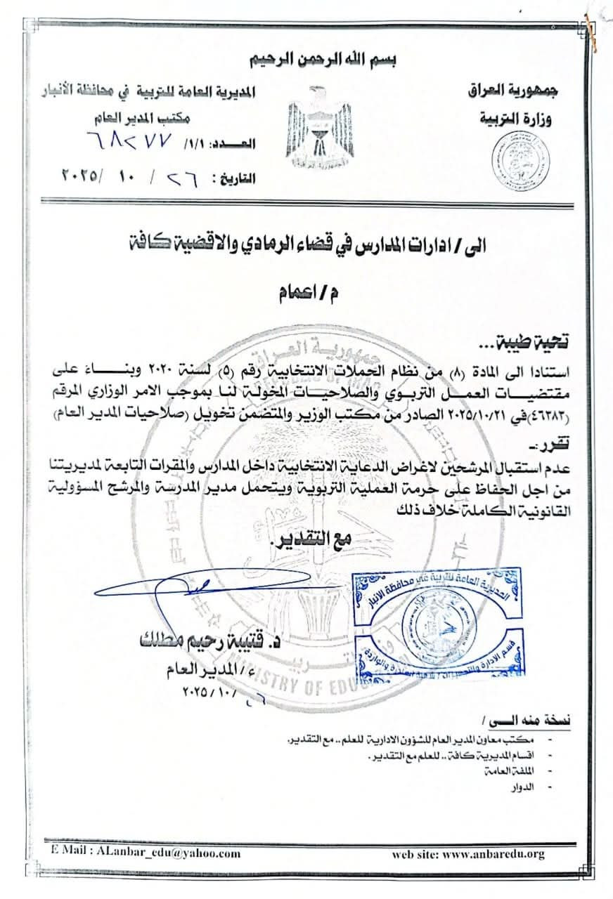منعت المديرية العامة للتربية في محافظة الأنبار، استقبال المرشحين للانتخابات البرلمانية في المدارس والمقرات التابعة للمديرية، بحسب وثيقة حصلت عليها وكالة نون الخبرية