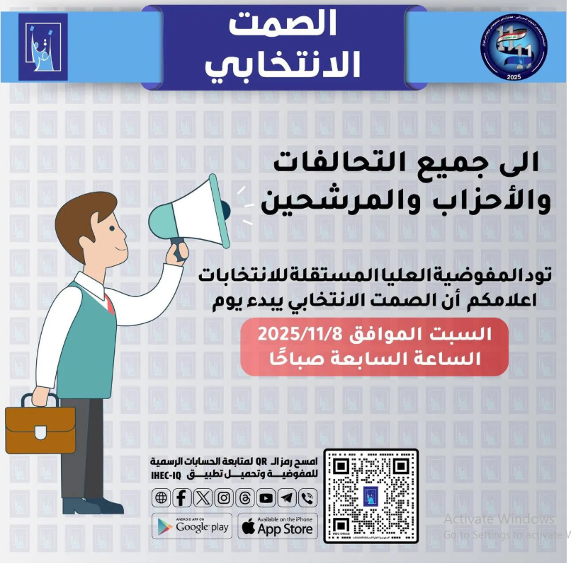 نوهت المفوضية العليا المستقلة للانتخابات، بأن موعد الصمت الانتخابي يبدأ يوم غد السبت الساعة السابعة صباحاً.
