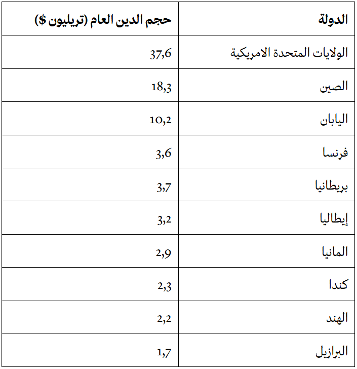 تظهر المؤشرات الدولية ان الدول الفاعلة اقتصاديا لديها عجز مالي في موازناتها، وتحقق نمو كبير نسبيا في حجم الدين العام لديها، ويظهر الجدول القادم حجم الدين لبعض الدول.