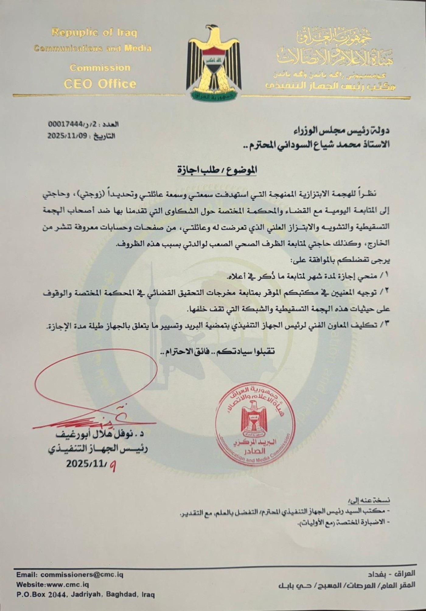 وأضاف، "يرجى تفضلكم بالموافقة على منحي إجازة لمدة شهر لمتابعة ما ذكر أعلاه، وتوجيه المعنيين في مكتبكم الموقر بمتابعة مخرجات التحقيق القضائي في المحكمة المختصة والوقوف على حيثيات هذه الهجمة التسقيطية والشبكة التي تقف خلفها، وتكليف المعاون الفني لرئيس الجهاز التنفيذي بتمضية البريد وتسيير ما يتعلق بالجهاز طيلة مدة الإجازة".