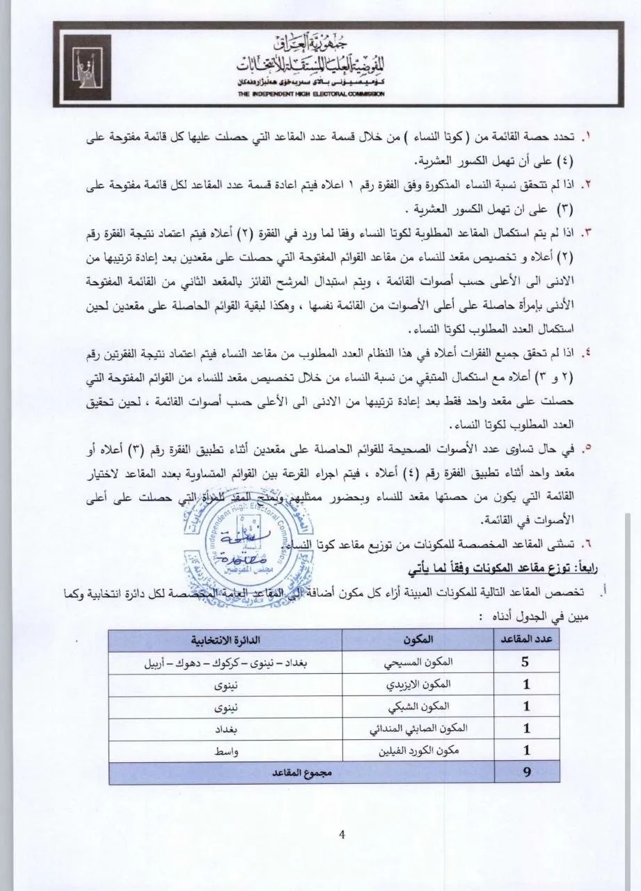 وبحسب الآلية، فإن عدد مقاعد القائمة يقسم على عدد 4، مع إهمال الكسور العشرية لاستخراج عدد مقاعد "كوتا النساء" فيها، وفي حال عدم استكمال مقاعد النساء في القائمة وفق هذا التقسيم، يجري تقسيم عدد مقاعدها على عدد 3.