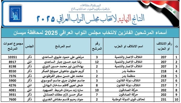 تنشر وكالة نون الخبرية نتائج الانتخابات النهائية لمحافظة ميسان.