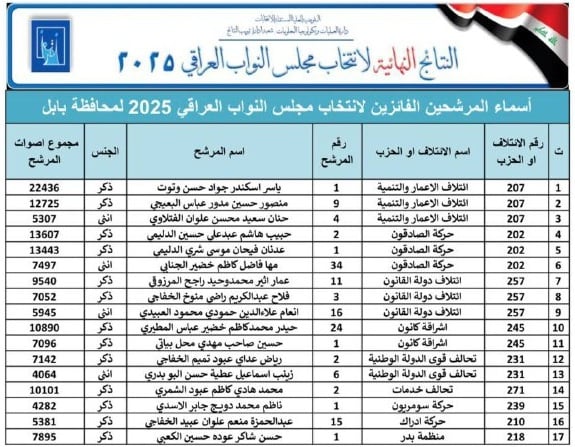 النتائج النهائية للانتخابات البرلمانية في محافظة بابل
