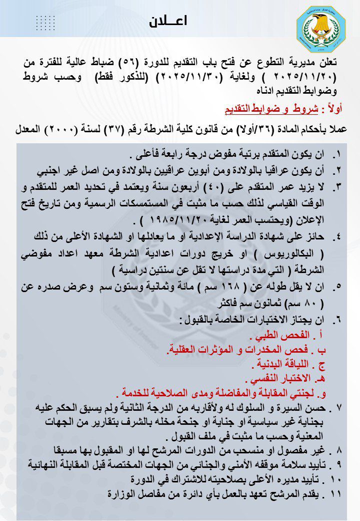 أعلنت وزارة الداخلية، اليوم الخميس، ضوابط وشروط القبول في الدورة (56) ضباط عالية.