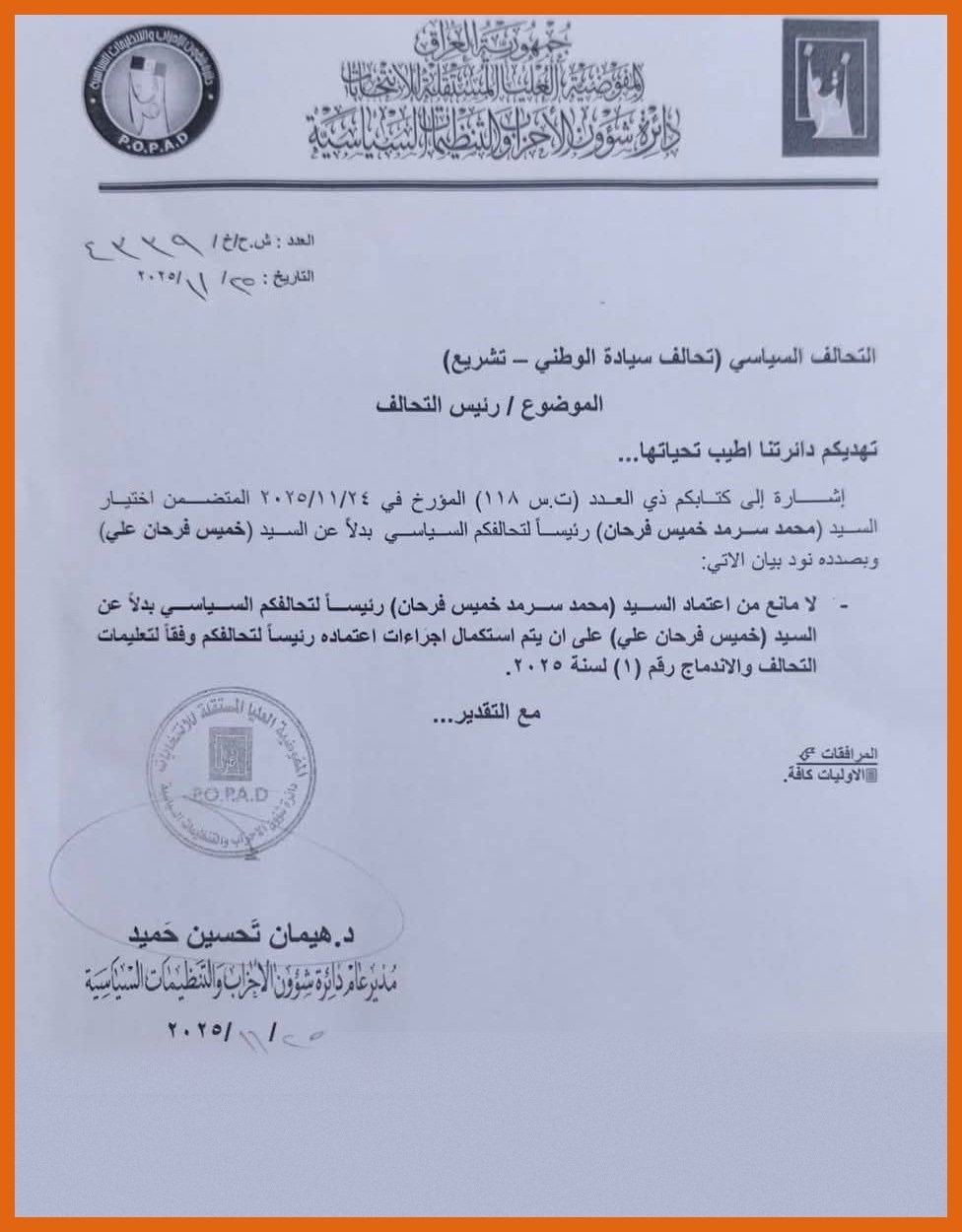 وجاء في وثيقة صادرة عن المفوضية، اليوم الثلاثاء (25 تشرين الثاني 2025)، "عدم وجود أي مانع من اعتماد محمد سرمد خميس فرحان رئيساً لتحالف سيادة الوطني، بدلاً عن خميس فرحان علي، وذلك استناداً إلى الطلب المقدم بتاريخ 24/11/2025 والمتعلق بتغيير رئاسة التحالف".