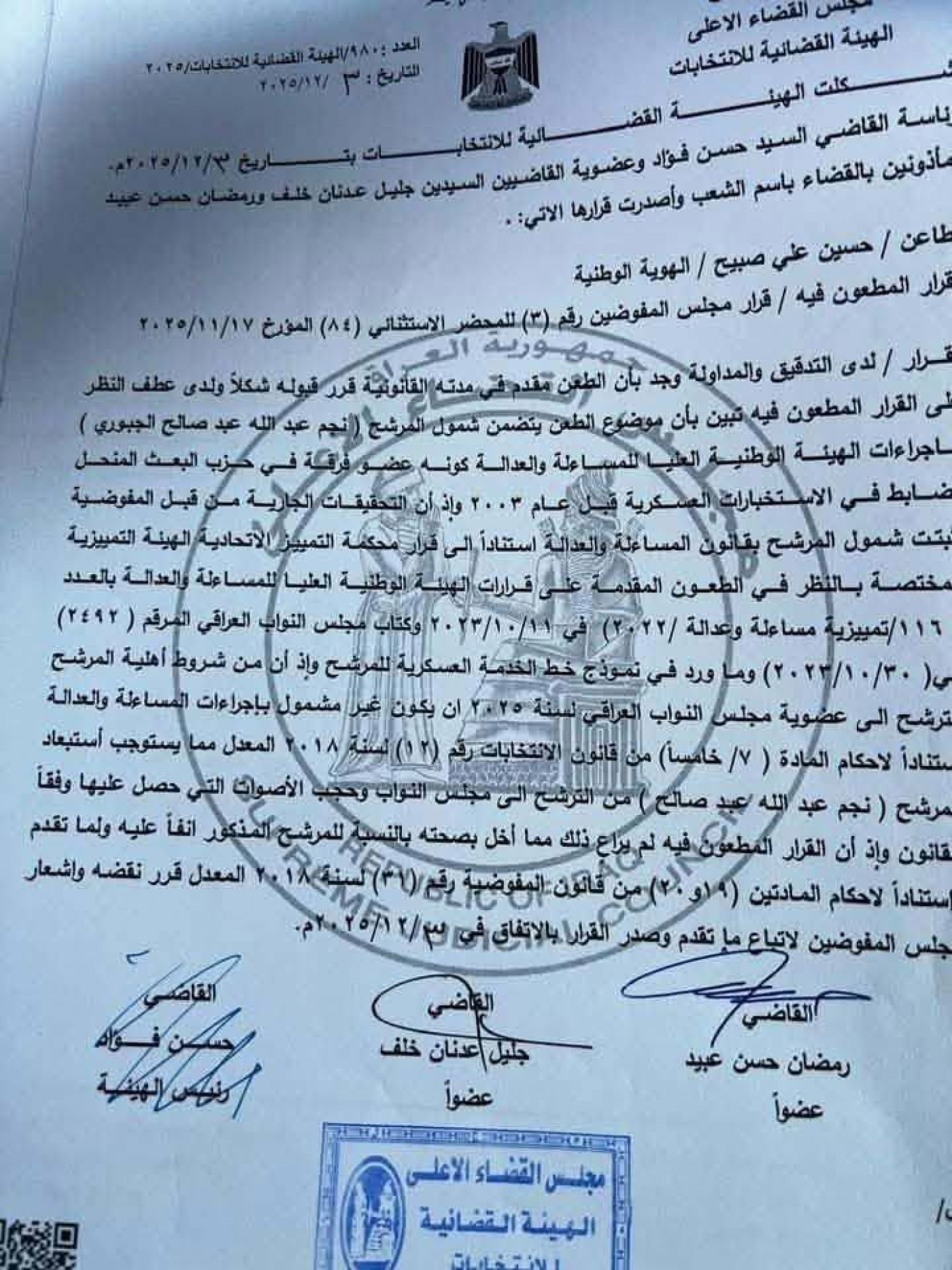 واظهرت وثيقة حصلت عليها وكالتنا، قرار الهيئة القضائية بقبول طعن تقدم بقرار مجلس المفوضين المصادقة على نتائج الانتخابات في 17 تشرين الثاني من بينها فوز نجم الجبوري، وذلك لشموله بالمساءلة والعدالة.