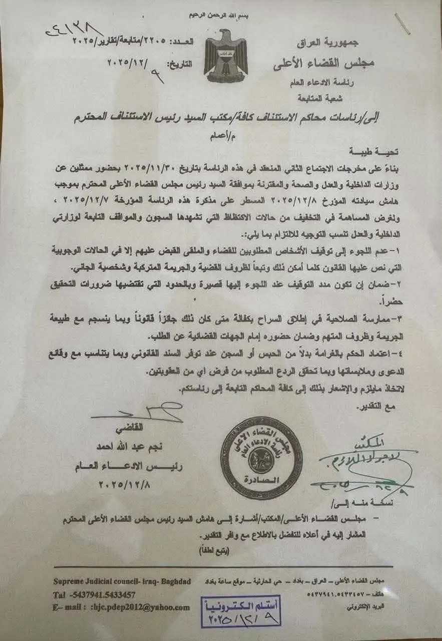 وبحسب الكتاب الرسمي الصادر عن رئاسة الادعاء العام، فإن التوجيه جاء استنادًا إلى مخرجات اجتماع رسمي عُقد بحضور ممثلين عن وزارات الداخلية والعدل والصحة، وبموافقة رئيس مجلس القضاء الأعلى، حيث تضمن عددًا من الضوابط، أبرزها عدم اللجوء إلى توقيف المطلوبين إلا في الحالات الوجوبية التي يفرضها القانون، مع مراعاة ظروف القضية والجريمة وشخصية المتهم.