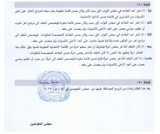 رابعاً إذا كان المقعد شاغر يخص امرأة يشترط أن تحل محلها امرأة من القائمة الانتخابية المفتوحة نفسها وفق أحكام هذا النظام ولا ينطبق هذا النص أذا كان المقعد الشاغر يخص امرأة ضمن المقاعد المخصصة للمكونات.