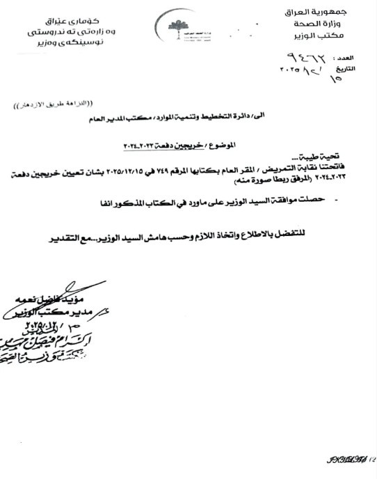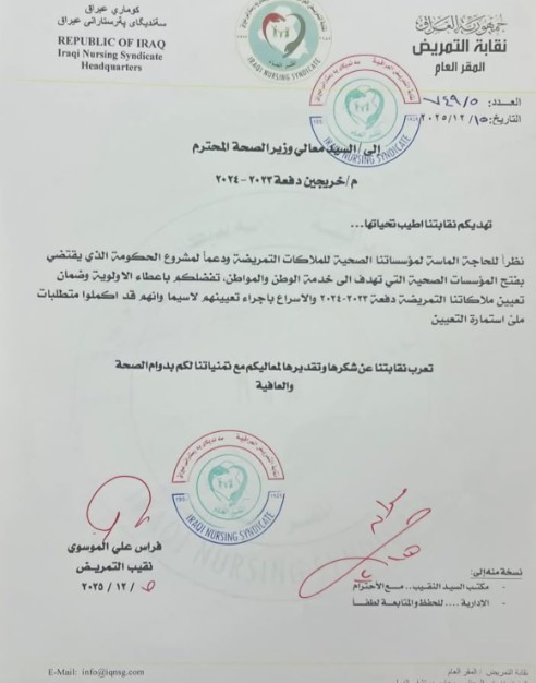 أعلنت نقابة التمريض العراقية، اليوم الأربعاء، موافقة وزير الصحة رسمياً على تعيين خريجي دفعة 2023-2024، وذلك بحسب وثيقة ادناه