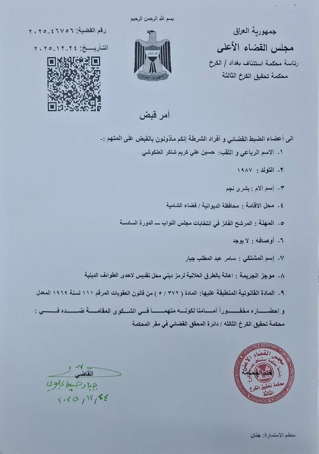 مذكرة قبض قضائية بحق النائب الفائز حسين العنكوشي (وثيقة)