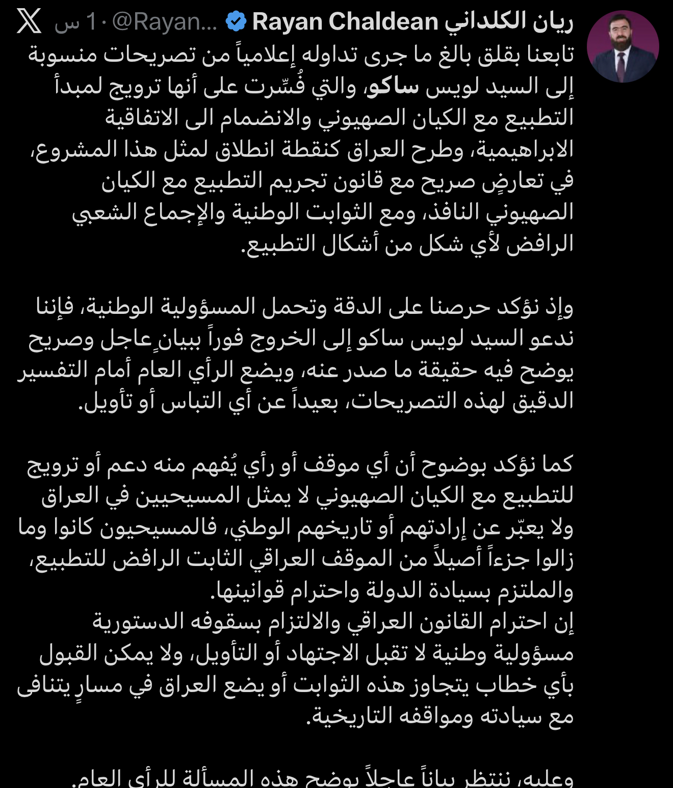 من جانبه، أعرب رئيس حركة بابليون ريان الكلداني، عن “قلقه البالغ إزاء ما جرى تداوله إعلامياً من تصريحات منسوبة إلى لويس ساكو، قال إنها فُسّرت على أنها ترويج لمبدأ التطبيع مع الكيان الصهيوني والانضمام إلى الاتفاقية الإبراهيمية، وطرح العراق كنقطة انطلاق لمثل هذا المشروع”.
