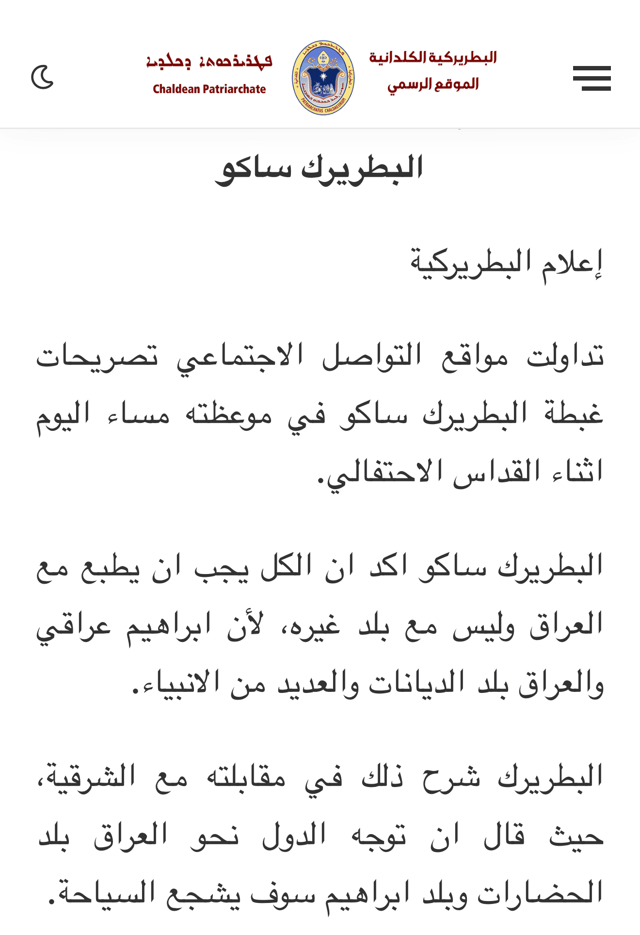 وفي توضيح لاحق، قال الموقع الرسمي للبطريركية الكلدانية، في بيان اطلعت عليه وكالة نون الخبرية، فجر اليوم الخميس، إنه “تداولت مواقع التواصل الاجتماعي تصريحات غبطة البطريرك ساكو في موعظته مساء اليوم أثناء القداس الاحتفالي”.