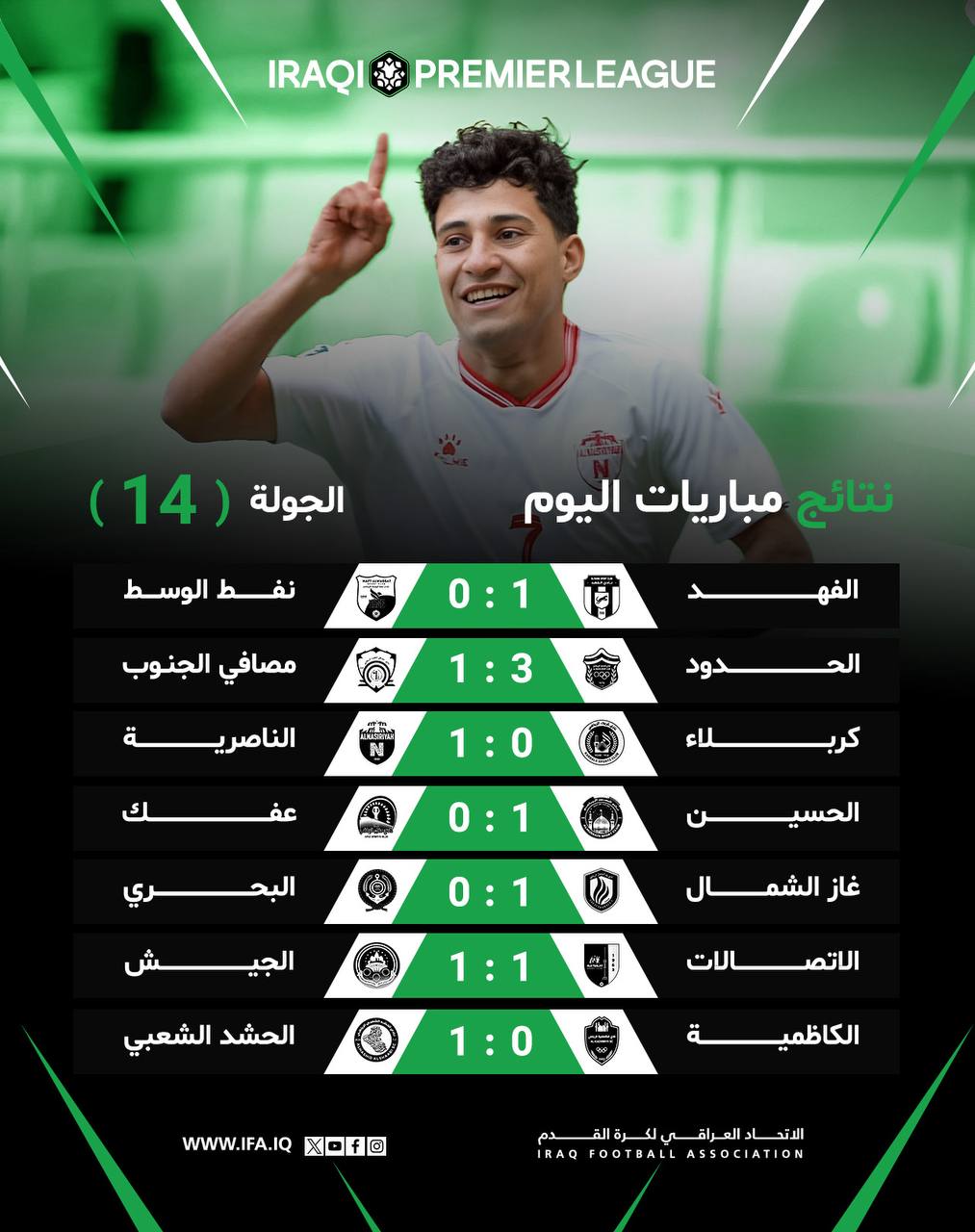 كما فاز فريق الناصرية على مضيفه فريق كربلاء بهدف دون مقابل.