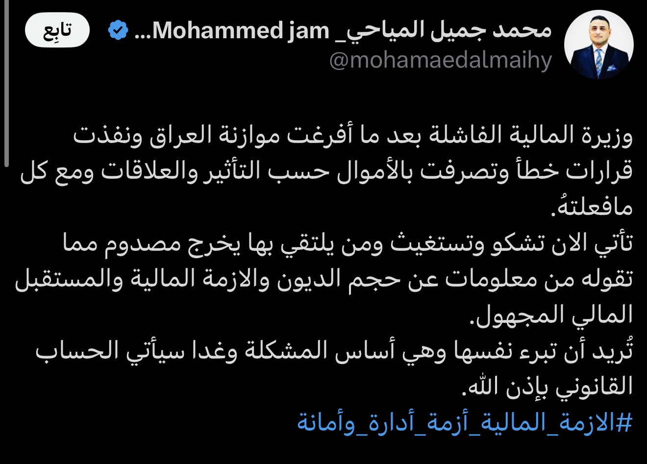 وكتب المياحي في تغريدة على "إكس"، قال إن "وزيرة المالية الفاشلة بعد ما أفرغت موازنة العراق ونفذت قرارات خطأ وتصرفت بالأموال حسب التأثير والعلاقات ومع كل مافعلتهُ، تأتي الآن تشكو وتستغيث ومن يلتقي بها يخرج مصدوم مما تقوله من معلومات عن حجم الديون والأزمة المالية والمستقبل المالي المجهول".
