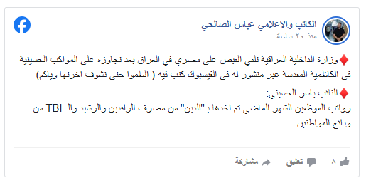 القبض على مصري في العراق بعد منشور على "فيسبوك" يتجاوز فيه على الشعائر الحسينية