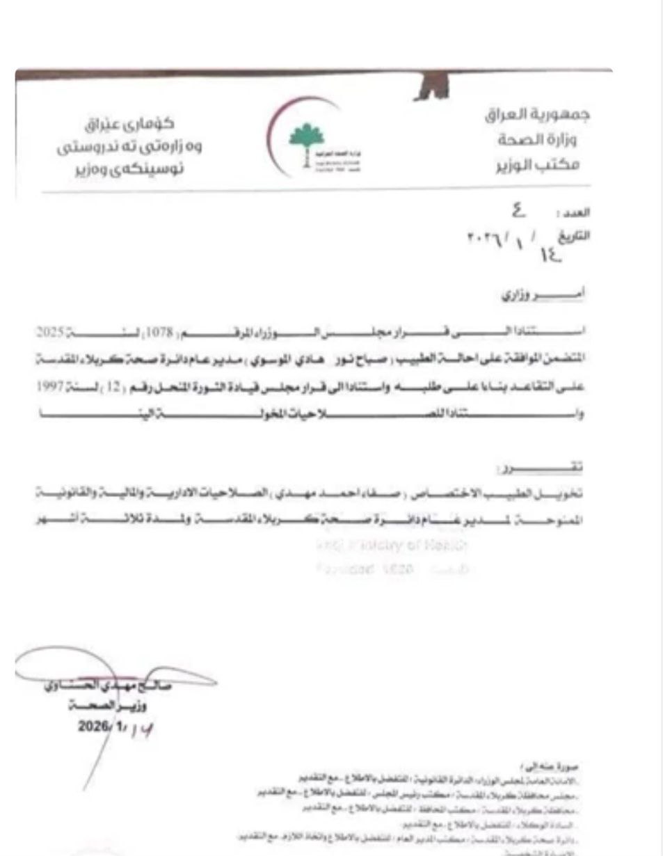 وكان وزير الصحة صالح الحسناوي قد خول الدكتور صفاء احمد مهدي الصلاحيات الادارية والمالية والقانونية الممنوحة لمدير عام صحة كربلاء لمدة ثلاثة اشهر حسب الامر الاداري المرقم (4) والصادر في الرابع عشر من شهر كانون الثاني من العام الجاري (2026)، بناء على موافقة مجلس الوزراء في احالة المدير السابق الدكتور صباح الموسوي الى التقاعد.