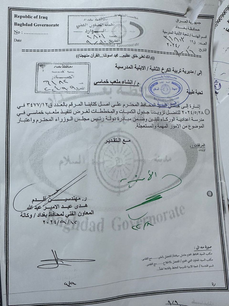 واضاف قائلا ان" الامور عندما توقفت امام حاجز عدم وجود التخصيصات المالية توجهنا لنطرق ابواب اخرى سعيا من الادارة لترميم بناية المدرسة فكان مراجعتنا هذه المرة الى محافظة بغداد واستحصلنا موافقة بجهود شخصية بمساعدة ولي امر احد طلبتنا ويعمل مهندسا في المحافظة، وتعاون معنا في متابعة اي كتاب يخص طلبنا واي موافقة يحتاجها، حتى تمكنا من استحصال موافقة محافظة بغداد شخصيا على مشروعين الاول يتضمن انشاء ملعب خماسي "تارتان" في ساحة المدرسة الترابية لكي يكون متنفسا للطلاب من جهة ويمكنهم ممارسة الرياضة في ساحة نظامية بمواصفات عالمية، وكذلك انجاز اعمال الصيانة والترميم لأي اضرار في المدرسة وفي مقدمتها السياج الخارجي المهدم ضمن مبادرة رئيس مجلس الوزراء "محمـد شياع السوداني"، ولكن فوجئنا ان احدى الموظفات المسؤولات ادرجت مدرستنا في جداول المشاريع التي سيتم تأهيلها بالتتابع وحسب الاوقات المحددة وليس استثناءً او افضلية كما اشار اليه هامش محافظ بغداد"، مؤكدا ان" ادارة المدرسة ابلغت التربية بأن باقي اجزاء السياج الخارجي آيلة للسقوط، وكما توقعنا فقد سقط جزء آخر منه قبل ايام وباقي الاجزاء على وشك السقوط، وكذلك جزء علوي من سقف المدرسة آيل للسقوط تساقط جزء منه، وهو امر سيعرض الطلبة للخطر او لدخول الكلاب السائبة التي انتشرت كظاهرة في كثير من المحافظات ومنها العاصمة بغداد والكل على اطلاع بما فعلته تلك الكلاب بالاطفال او الناس، بالرغم من ان المدرسة اتخذت تدابير مهمة في تواجد المدرسين خلال الفرص بين الدروس ودرس الرياضة في الساحة والتعاون مع الاهالي الذين تحيط بيوتهم بالمدرسة على عدم السماح لاي احد بالدخول الى بنايتها، لكن الخطر يبقى قائم".