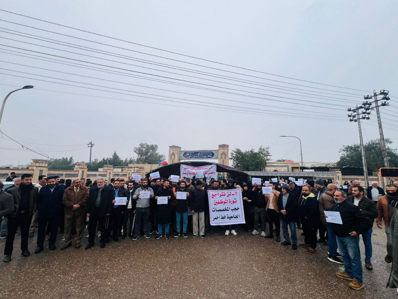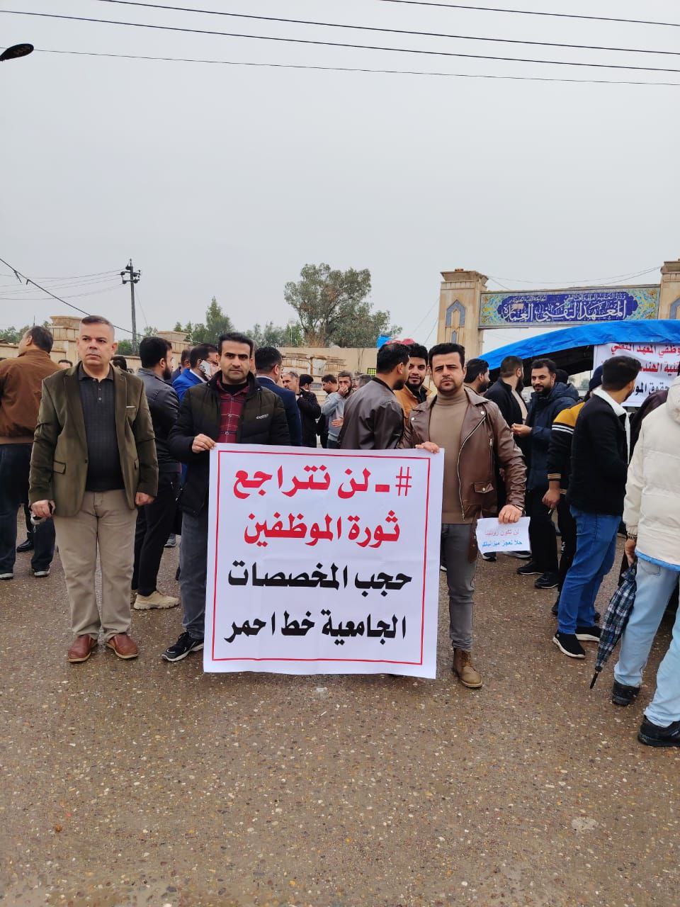 تواصل الكوادر الجامعية في ميسان، اعتصامها المفتوح أمام بوابة جامعة ميسان والمعهد التقني - العمارة، لليوم الثالث على التوالي، احتجاجاً على القرارات الأخيرة المتعلقة بقطع مخصصاتهم المالية.