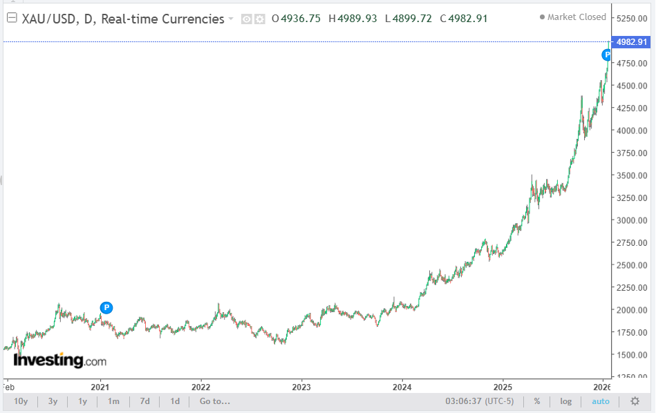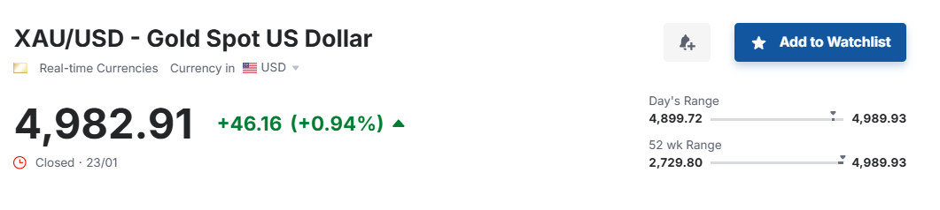 وارتفع سعر الذهب الفوري بنسبة 0.9% يوم الجمعة 23 كانون الثاني، ليصل إلى 4,982.91 دولاراً للأونصة.
