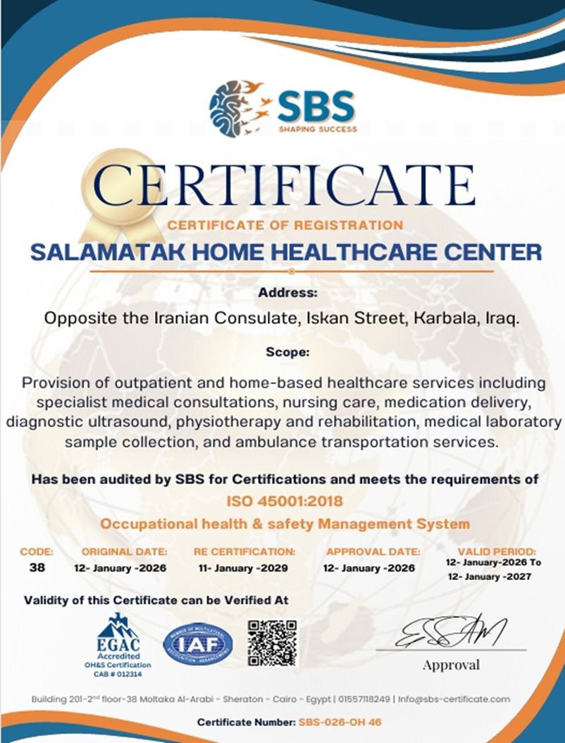 وقال مدير المركز الدكتور "محمـد حمزة كاظم" في تصريح خص به وكالة نون الخبرية انه" تنفيذا لتوجيهات المتولي الشرعي للعتبة الحسينية المقدسة الشيخ "عبد المهدي الكربلائي" ورئيس هيئة الصحة والتعليم الطبي الدكتور "حيدر حمزة العابدي" المتضمنة التحول الى حوكمة المؤسسات الصحية وفق المعايير الدولية، يعلن مركز سلامتك للرعاية الصحية المنزلية عن حصوله على شهادتي نظام ادارة الجودة الآيزو (9001)، ونظام ادارة السلامة والصحة المهنية الآيزو (45001)، مشيرا الى ان "هذا الانجاز يمثل تحولا استراتيجيا نحو العمل المؤسسي المنضبط، حيث نجح المركز في تبني نموذج تشغيلي يعتمد على التخطيط المسبق، وتوحيد الاجراءات، وتفعيل مؤشرات الاداء"، مؤكدا ان" هذه الخطوات لا تهدف الى تنظيم الاداء فحسب، بل لضمان استدامة جودة الرعاية المنزلية ورفع كفاءة الملاكات البشرية، وتقليل المخاطر لضمان اقصى درجات السلامة للمرضى، وعليه فإننا نؤكد في مركز سلامتك للرعاية الصحية المنزلية ان الحصول على تلك الشهادتين هو بداية المسار وليس نهايته حيث نلتزم بجعل ثقافة الجودة نهجا دائما للتطوير المؤسسي المستمر".