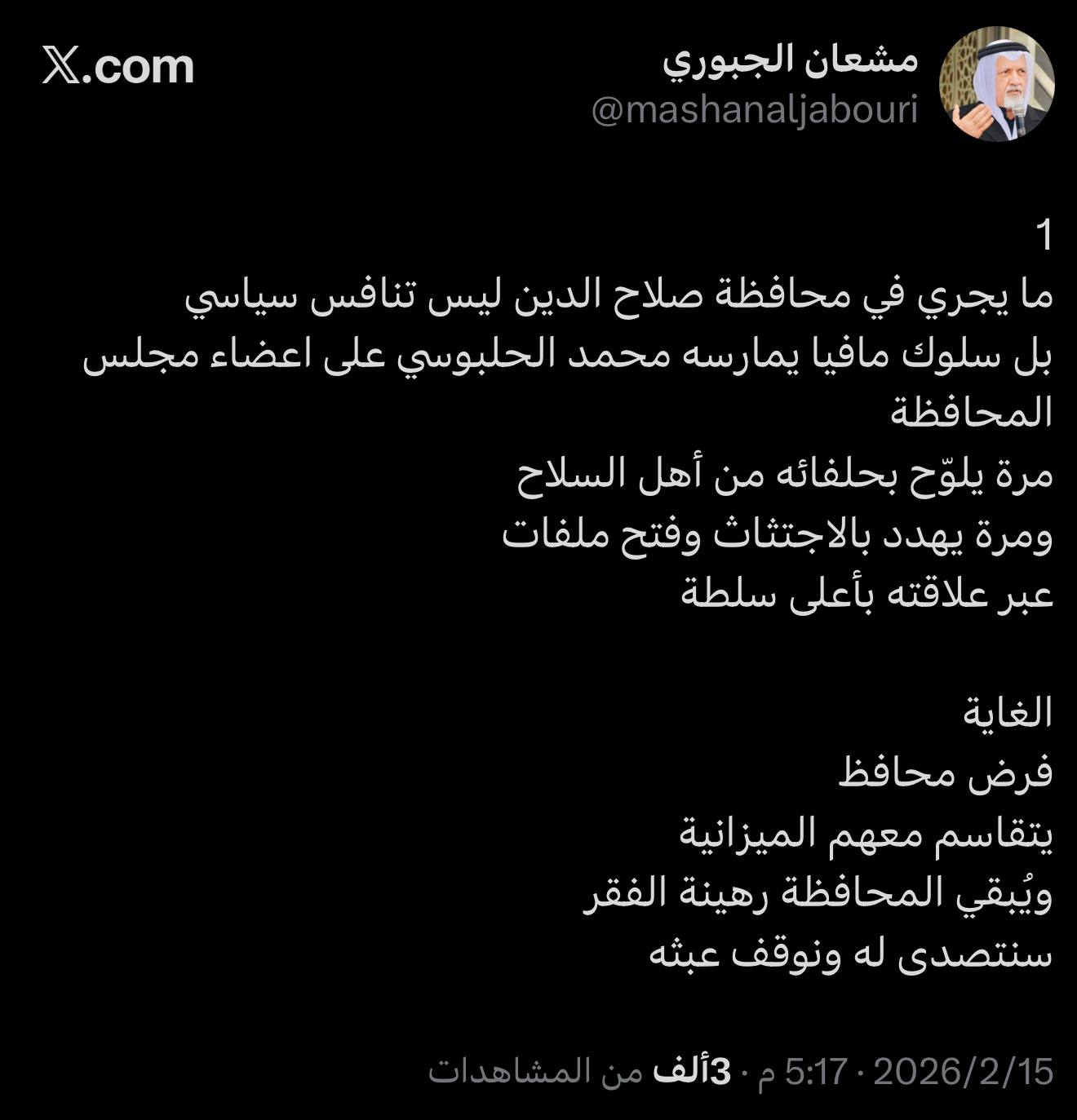 وقال الجبوري، في تدوينة تابعتها وكالة نون الخبرية، إن "ما يجري في صلاح الدين هو محاولة لفرض إرادة سياسية على أعضاء مجلس المحافظة"، متهما محمد الحلبوسي بالتلويح بأوراق ضغط متعددة، من بينها حلفاء مسلحون أو التهديد بفتح ملفات واجتثاث عبر علاقات مع جهات عليا.