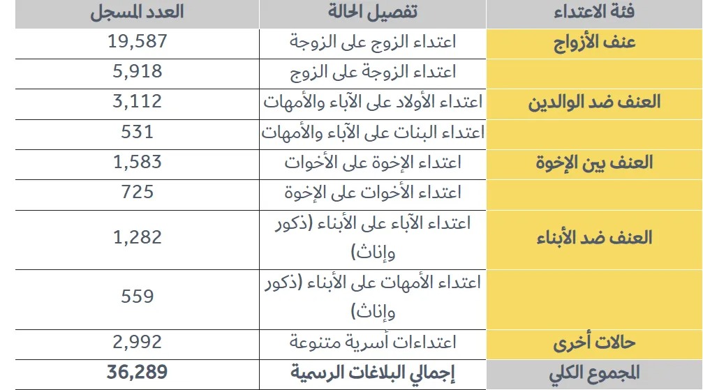 وبحسب جدول الإحصاءات المرفق مع التقرير، تصدرت اعتداءات الأزواج المشهد بـ19 ألفاً و587 حالة اعتداء الزوج على الزوجة، تلتها 5 آلاف و918 حالة اعتداء الزوجة على الزوج.